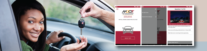 The MD Practice Driving Test mobile app is available for download in the iTunes and Google Play stores. The app can also be accessed through the state of Maryland’s official website, www.Maryland.gov or MDOT MVA’s website, http://www.mva.maryland.gov/mobile/.