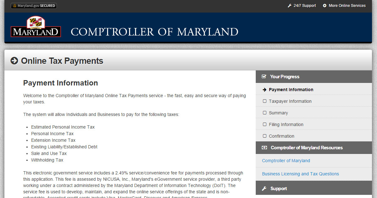 Comptroller Online Tax Payment Service was developed at no charge for the Comptroller of Maryland by NIC Maryland, through the self-funded eGovernment services contract with the State Department of Information Technology (DoIT).
