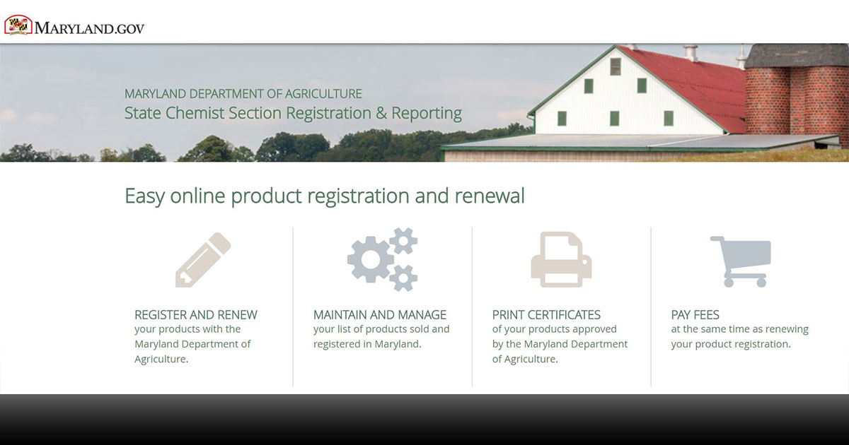 ANNAPOLIS, Md. – Maryland Department of Agriculture (MDA) recently launched the State Chemist Product Registration portal that allows manufacturers to electronically submit registration renewals and applications for products that are required to be registered in the state of Maryland.